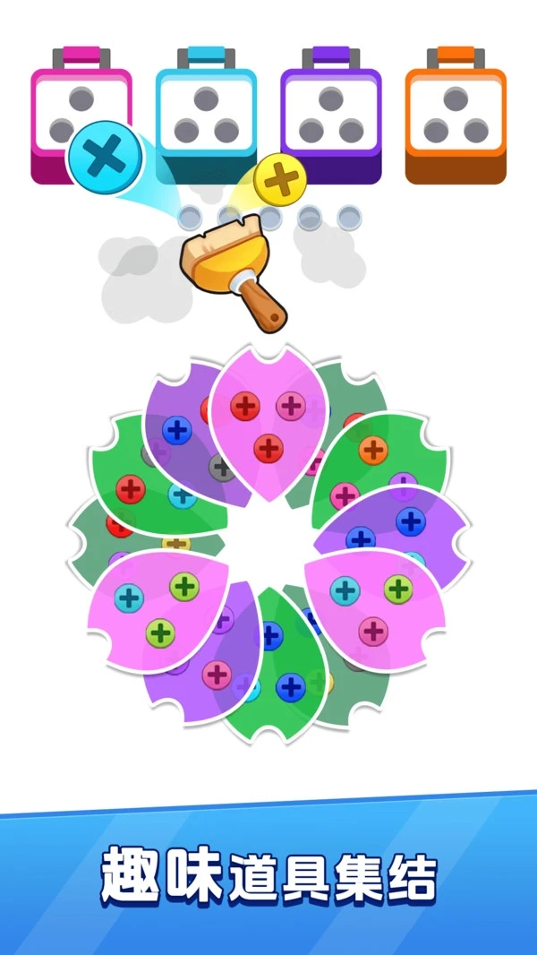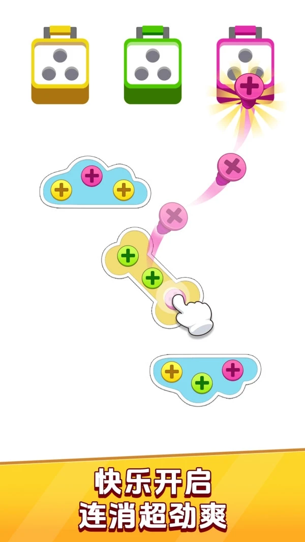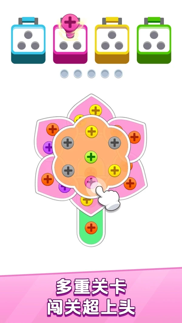 在这个游戏里,你需要仔细观察那些螺丝,把颜色相同的螺丝找出来进行消除,这就是颜色匹配消除的玩法。