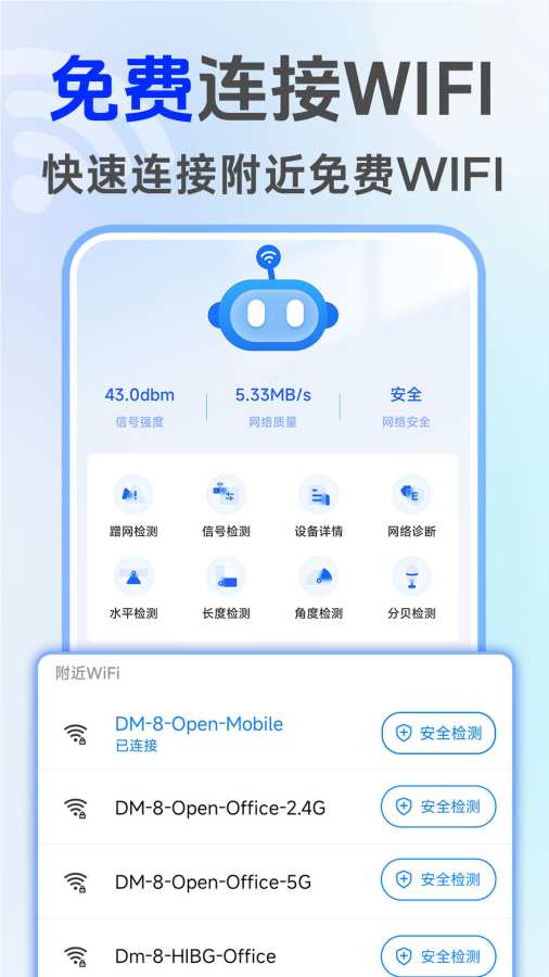 万能WiFi连接大师是一款特别好用的手机WiFi管理软件,在这个软件中可以自动搜索WiFi信号较强的wifi,同时也可以对已连接的五险网络进行测速。软件带来的功能非常实用,大家需要wifi管理,可以来下载软件体验一下。